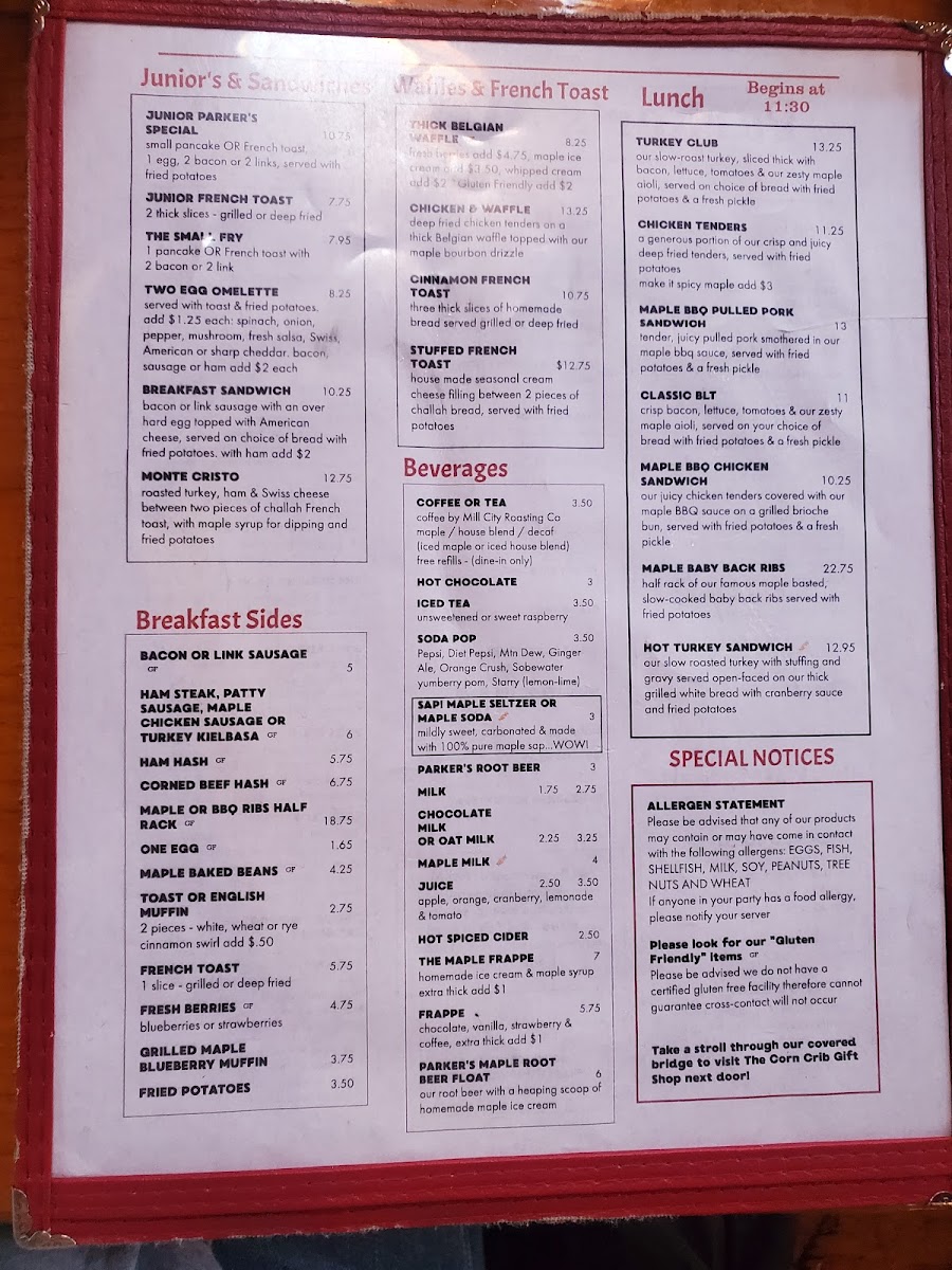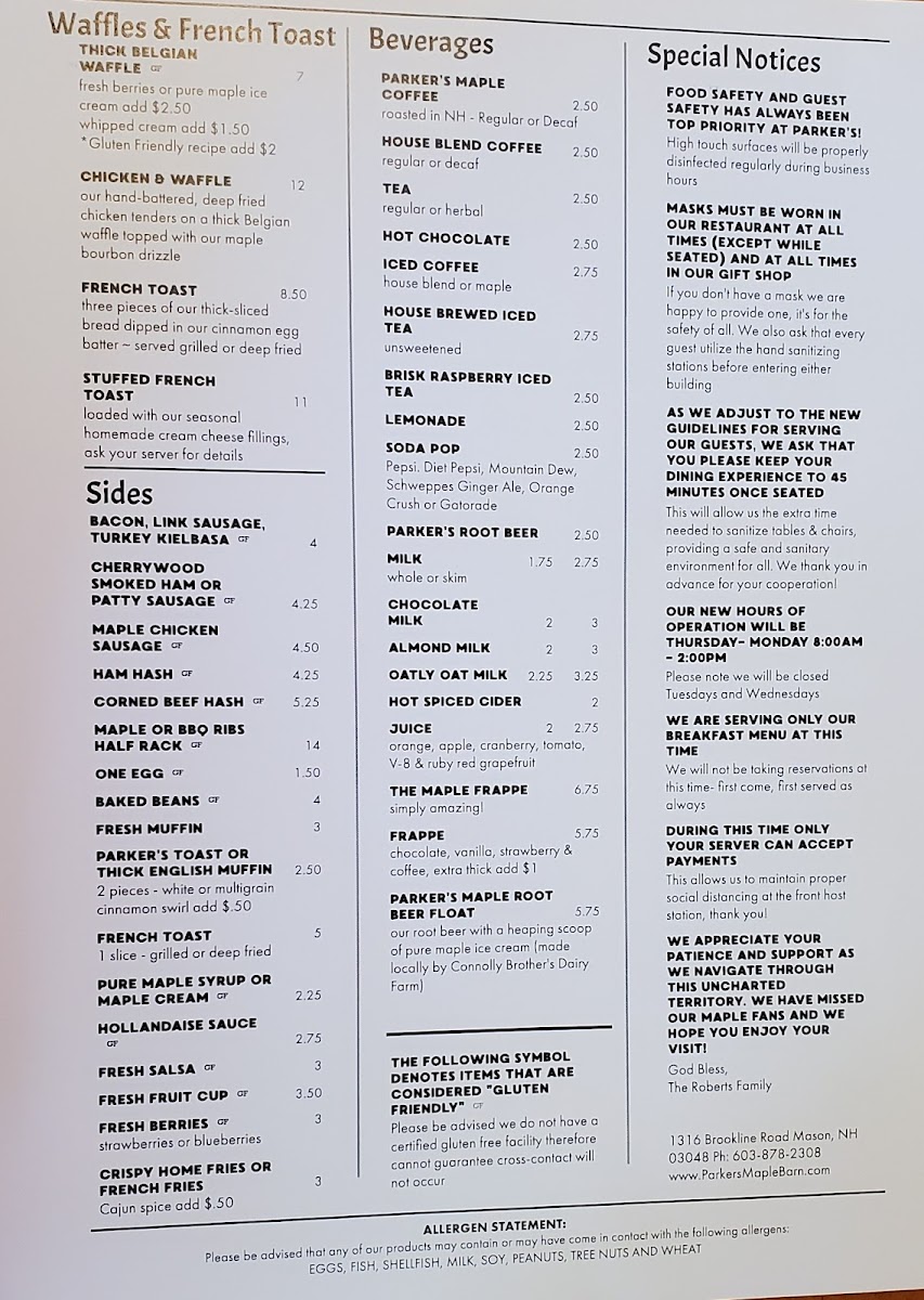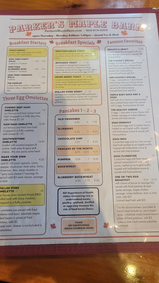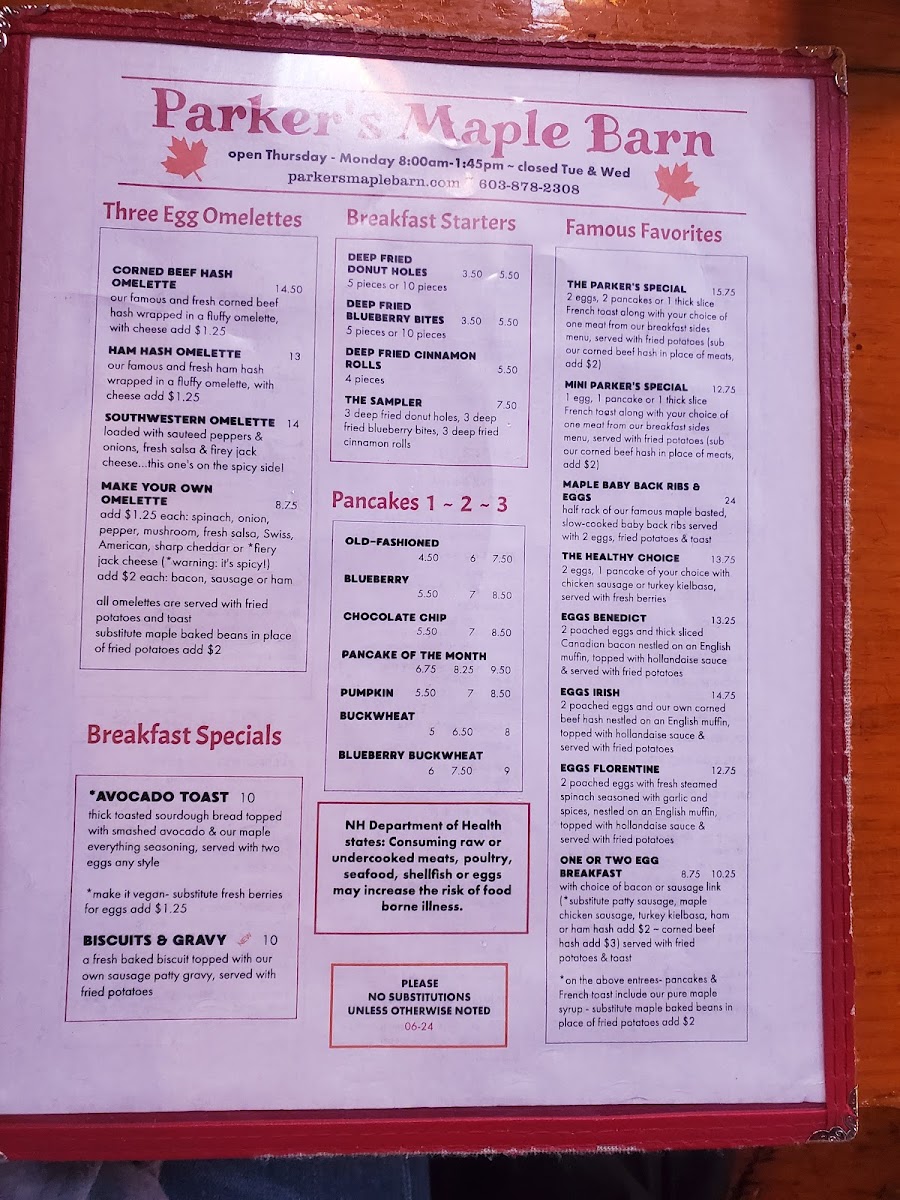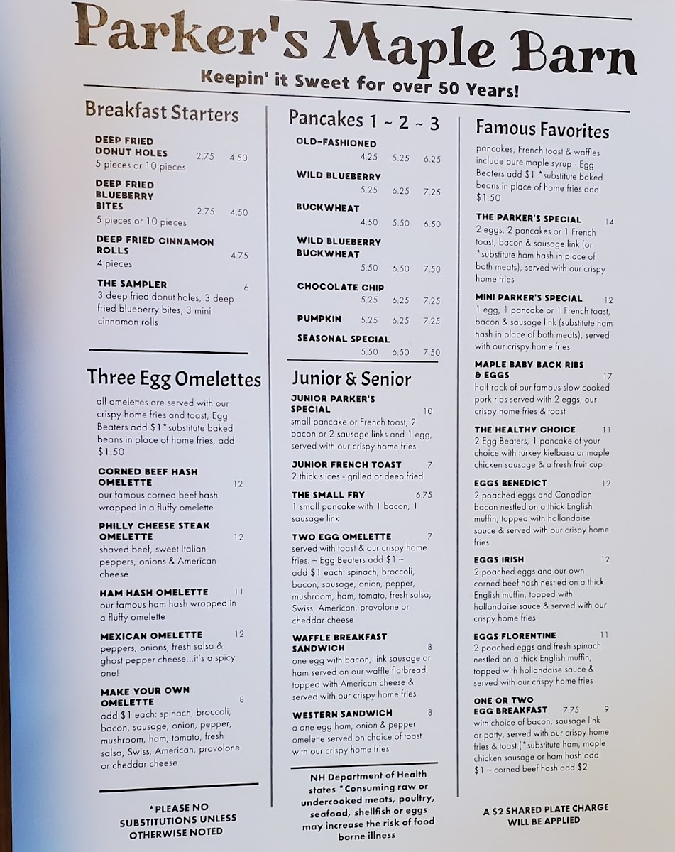 At Parker's Maple Barn Menu, you’ll find a warm, welcoming atmosphere that sets the stage for a memorable dining experience. Located at 1349 Brookline Rd, Mason, NH, this charming spot is all about comfort food with a twist. Whether you’re craving a hearty breakfast, a delicious lunch, or just a sweet treat, the menu offers something for everyone. From their famous maple syrup that’s locally made to their signature pancakes, it’s clear that the folks here know how to deliver rich flavors. Every dish is prepared with care and served with a smile, making it a perfect place to enjoy a relaxed meal with family or friends.